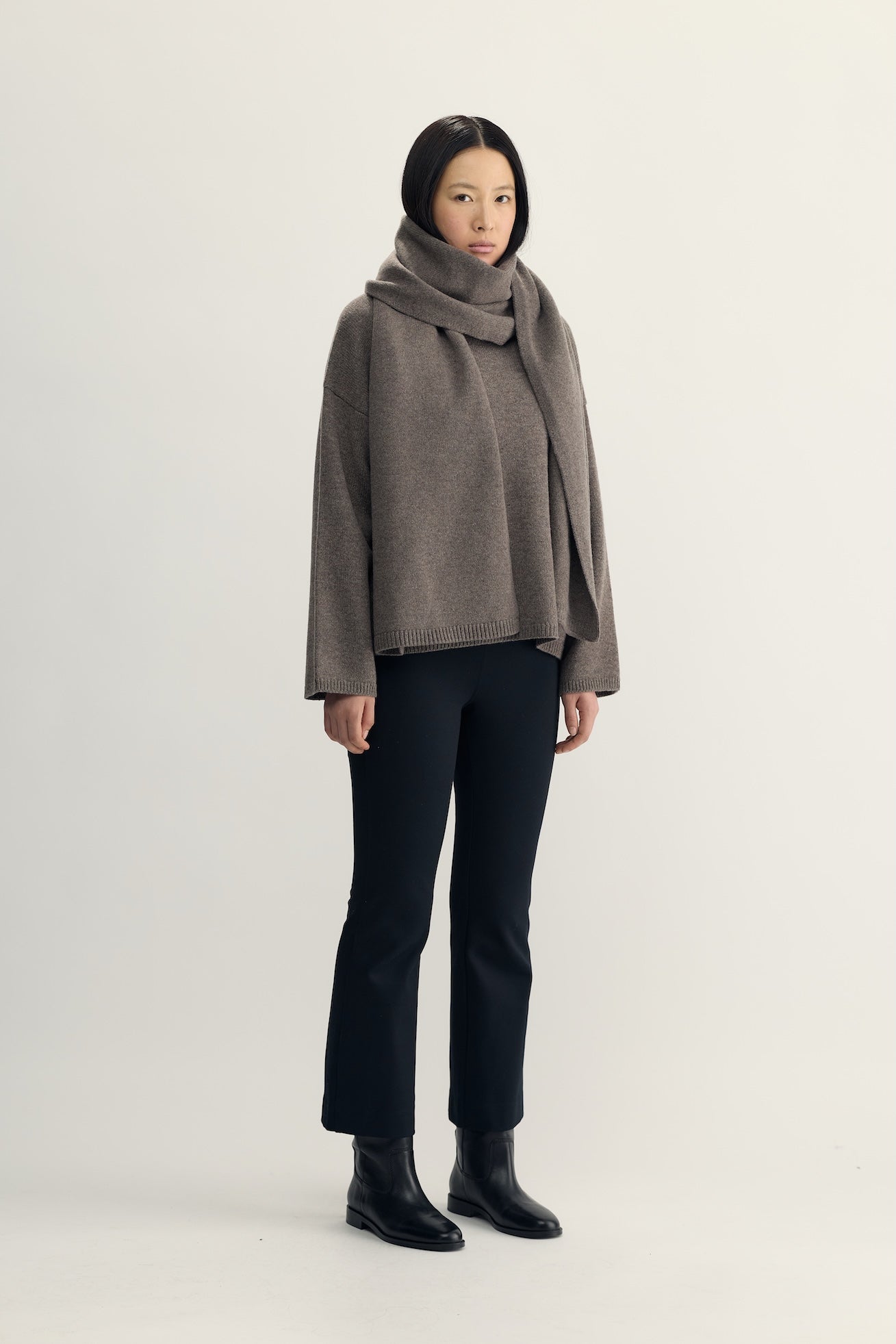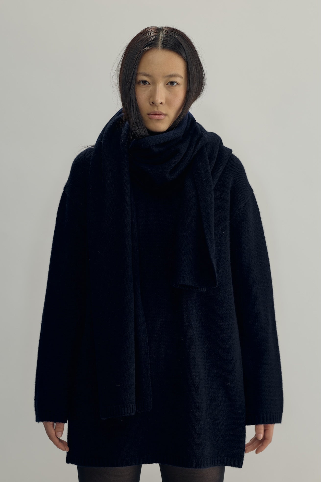 Mjuk slätstickad halsduk i 100 % ull med smal ribbstickning nertill. Den är vid och lång och går att bära på olika sätt; löst hängande över axlarna eller svept flera varv runt halsen.